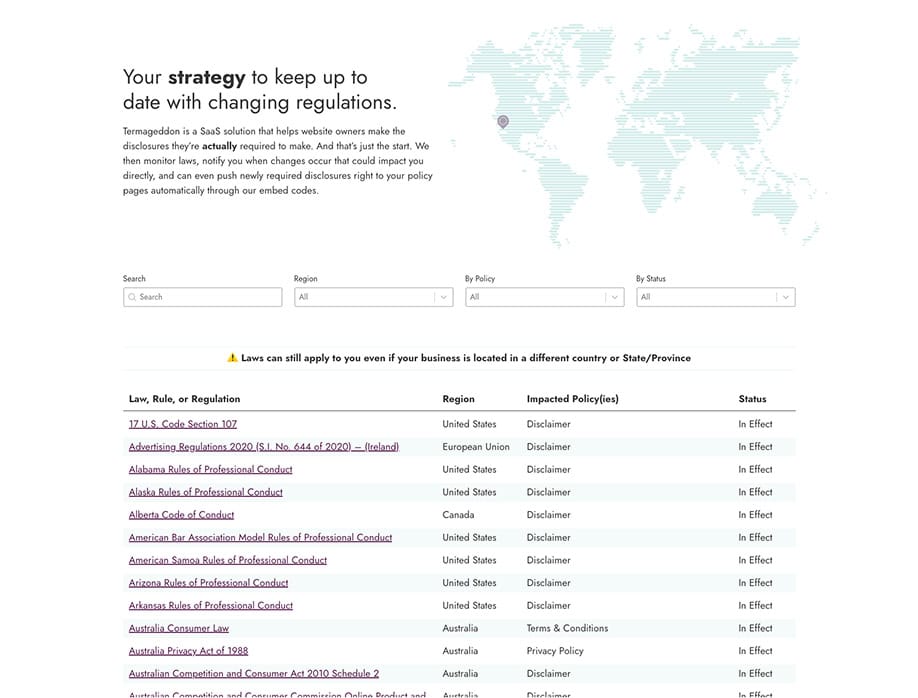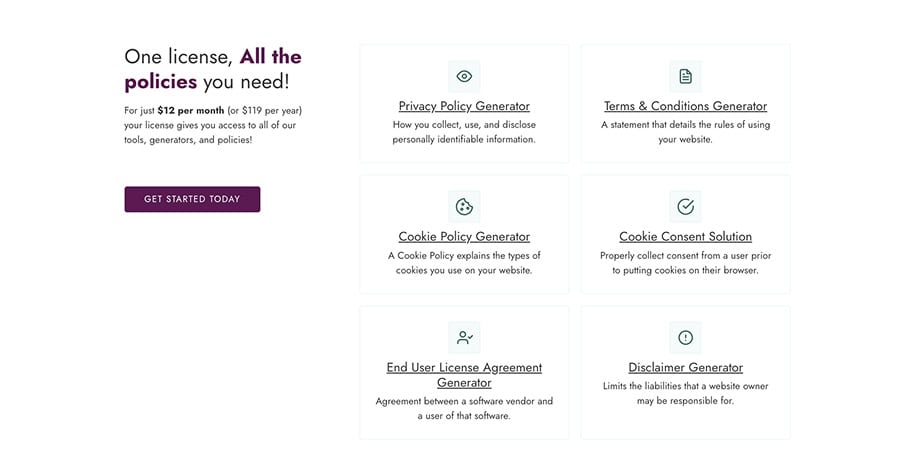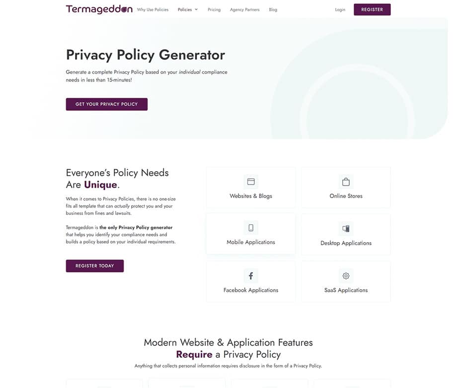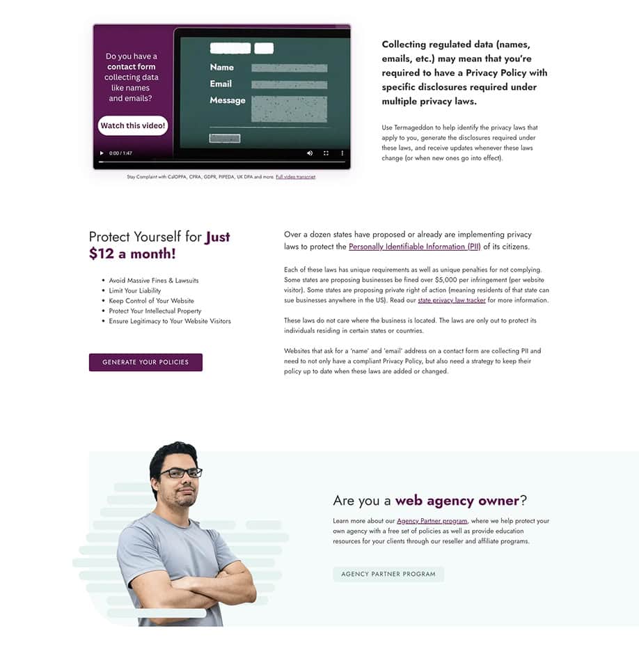 Termageddon is one of the top website-policy generators on the market, used by agencies, designers, law firms, and anyone who needs to stay compliant with constantly changing privacy laws.